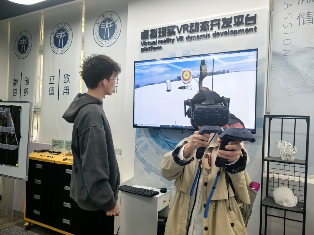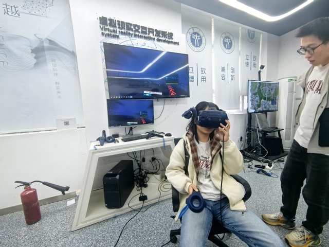 11月14日,江汉大学人工智能学院在虚拟现实教学实训中心组织开展了一场别开生面的“心域漫游”VR+心理健康教育活动。同学们通过佩戴专业VR设备,在虚拟场景中自由探索,体验科技与心理教育融合带来的全新感受,在沉浸式互动中释放压力、调节情绪。