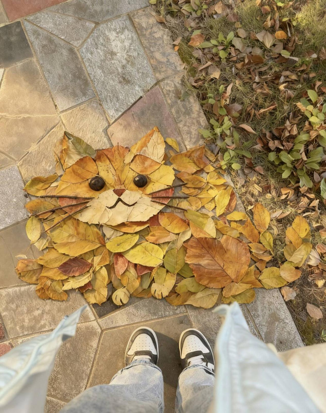 从零散素材到完整画面,创作过程也成为同学们放松身心的契机。有人反复比对柳叶弧度,勾勒心形轮廓;有人主动分享红枫叶片,温暖他人的作品;心理委员组织十余位同学协力完成大型叶艺,叶片交叠如并肩的身影;还有同学精心以枯叶拼出“JHUN”字样,指尖轻压,定格校园记忆。这场无需纸笔的创作,不仅缓解了学业压力,更在递叶、协作的细碎互动中,拉近了彼此的距离,增进了理解与默契。