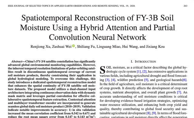 近日,我院在对地观测数据处理领域取得一项重要研究进展。学院研究生许仁炯为第一作者、魏祖帅副教授为通讯作者的研究论文《Spatiotemporal Reconstruction of FY-3B Soil Moisture Using a Hybrid Attention and Partial Convolution Neural Network》在遥感领域专业期刊《IEEE Journal of Selected Topics in Applied Earth Observations and Remote Sensing》(IEEE JSTARS)上发表。该期刊系中科院二区TOP期刊,影响因子为5.4