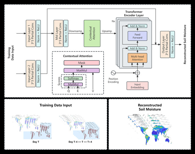 虽然针对SMAPAMSR2等国际卫星数据的重建算法已较为成熟,但适用于国产风云系列卫星的同类算法仍有较大提升空间。为解决这一问题,该研究团队针对我国FY-3B卫星土壤水分产品特点,提出了一种原创性时空重建方法“TransCNN”。该方法的核心在于融合了部分卷积神经网络与Transformer两种结构,部分卷积网络用于提取土壤水分的空间异质性特征,而Transformer结构则用于建模其在长时间序列上的依赖关系。为适应土壤水分数据的时空特性,模型采用了双通道输入架构,分别处理单日空间数据与长时序据,以实现多尺度特征的有效捕捉。