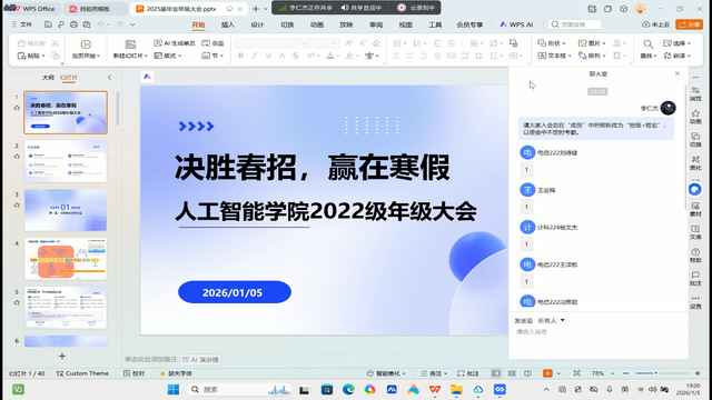 为助力2026届毕业生准确把握就业形势,提升就业竞争力,科学规划寒假及新学期,2026年1月5日,人工智能学院通过线上方式成功举办了以“决胜春招,赢在寒假”为主题的2022级年级大会暨就业动员会。本次大会由毕业班辅导员李仁杰老师主持,毕业班辅导员王亚楠老师、6名优秀学长学姐及同年级学生进行专题分享求职就业经验,学院毕业年级430余名学生及各班主任老师共同参与。