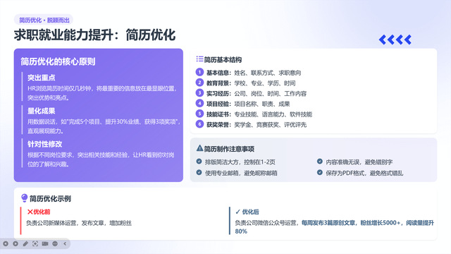 毕业班辅导员王亚楠老师为同学们带来了干货满满的求职能力提升讲座。王老师以简历优化和面试技巧为核心,通过“优化前”与“优化后”的直观对比,讲解了如何突出重点、量化成果。同时,对劳动合同签订、社会保险、试用期权益等关键法律知识进行了科普,帮助同学们筑牢职场权益的“防火墙”。