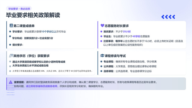 会议重申了毕业相关的硬性要求,包括第二课堂学分、志愿服务时长、体测标准、英语四级等,提醒同学们及时登录系统核查,确保所有毕业条件达标,为顺利毕业扫清障碍。
