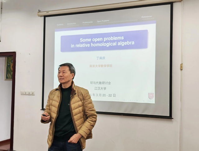 3 月21 日上午,研讨会正式开幕。江汉大学人工智能学院副院长万优艳教授致欢迎辞,学院相关领导对与会专家学者表示热烈欢迎。本次研讨会聚焦相对同调代数、余拟 Hopf 代数、AS-Gorenstein 奇点、量子丛代数、(n+2)-角范畴、温和代数、链同伦范畴等环与代数前沿方向,邀请多位领域内权威学者作特邀学术报告。南京大学丁南庆教授系统梳理了相对同调代数中若干公开问题的研究进展与发展方向;南京大学刘公祥教授分享了余拟 Hopf 代数的根系理论研究成果;上海财经大学李昊南博士深入阐释 AS-Gorenstein 孤立奇点及其解消理论;南京师范大学张海诚教授介绍 Hall 代数在量子丛代数范畴化中的应用;长沙理工大学周潘岳教授、贵州大学刘雨喆副教授、杭州师范大学胡江胜教授也分别围绕 (n+2)-角范畴中的余挠对、温和代数的 Recollements 与模结构、平衡对诱导的链同伦范畴 Quillen 等价等课题作精彩报告。与会学者围绕报告内容热烈交流、深入探讨,充分展现了代数领域的前沿活力与研究热度。
