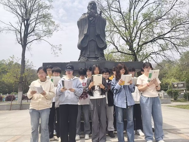 在图书馆外的孔子像前,师生们整齐列队,庄重诵读《七律·长征》以及《论语》中的经典章句,将红色精神与儒家“仁义”“家国天下”的思想相呼应,在传统文化的浸润中升华爱国情感。此外,各班积极组织学唱红色歌曲《祖国不会忘记》,并开展“清明诗会”,诵读杜牧《清明》、黄庭坚《清明》等古典诗词,在诗词中体味节日的文化底蕴。
